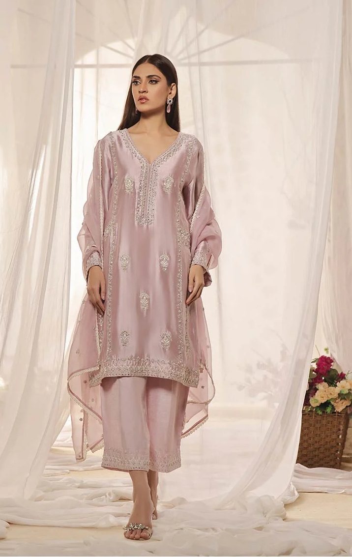 Elevate your style with this stunning masterpiece, crafted from the highest quality Russian Silk. This ensemble features a modern loose-cut design that balances comfort with high-end fashion. The delicate embroidery, enriched with shimmering sequence and traditional Zari work, exudes a captivating elegance perfect for any festive or formal occasion.