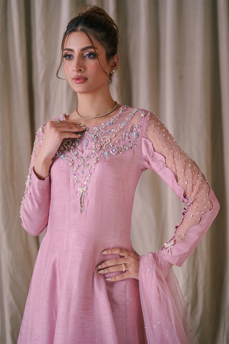 Experience the most loved silhouette in a breathtaking Blush Pink palette. This ensemble features a regal Kalidar maxi crafted from pure PK Raw Silk, designed to cascade gracefully for a dramatic and feminine look. The neckline is the focal point—exquisitely hand-embroidered and encrusted with shimmering diamantes. With playful scalloped sleeves and delicate handmade bows, this suit is a true celebration of romantic artistry.